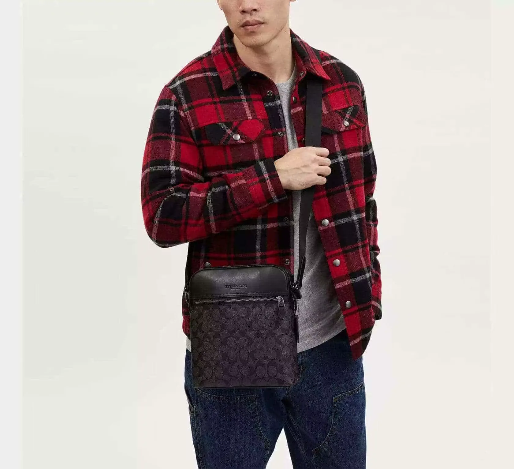 Универсальная мужская сумка Coach Houston Flight Bag из фирменного холста с покрытием и изысканной телячьей кожи. Имеет несколько карманов: внешний передний карман на молнии, внешний накладной карман и внутренний многофункциональный карман. Вместительное основное отделение с застёжкой-молнией позволяет разместить iPad®, телефон, кошелёк и небольшие туалетные принадлежности. Подкладка тканевая. Регулируемый плечевой ремень обеспечивает ношение на плече или через плечо. Может использоваться как дорожная, школьная или рабочая сумка.