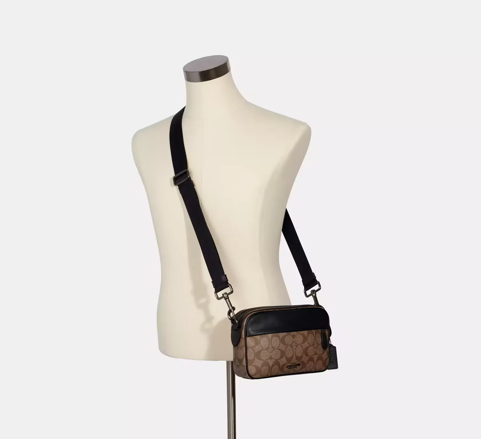 Мужская сумка через плечо изготовлена из фирменного холста с покрытием и гладкой телячьей кожи. Модель имеет тканевую подкладку и регулируемый ремень длиной 63,5 см для ношения на плече или через плечо. Особенности включают внешний накладной карман, внутренний многофункциональный карман и двойную застежку-молнию. Номер стиля — CV921.