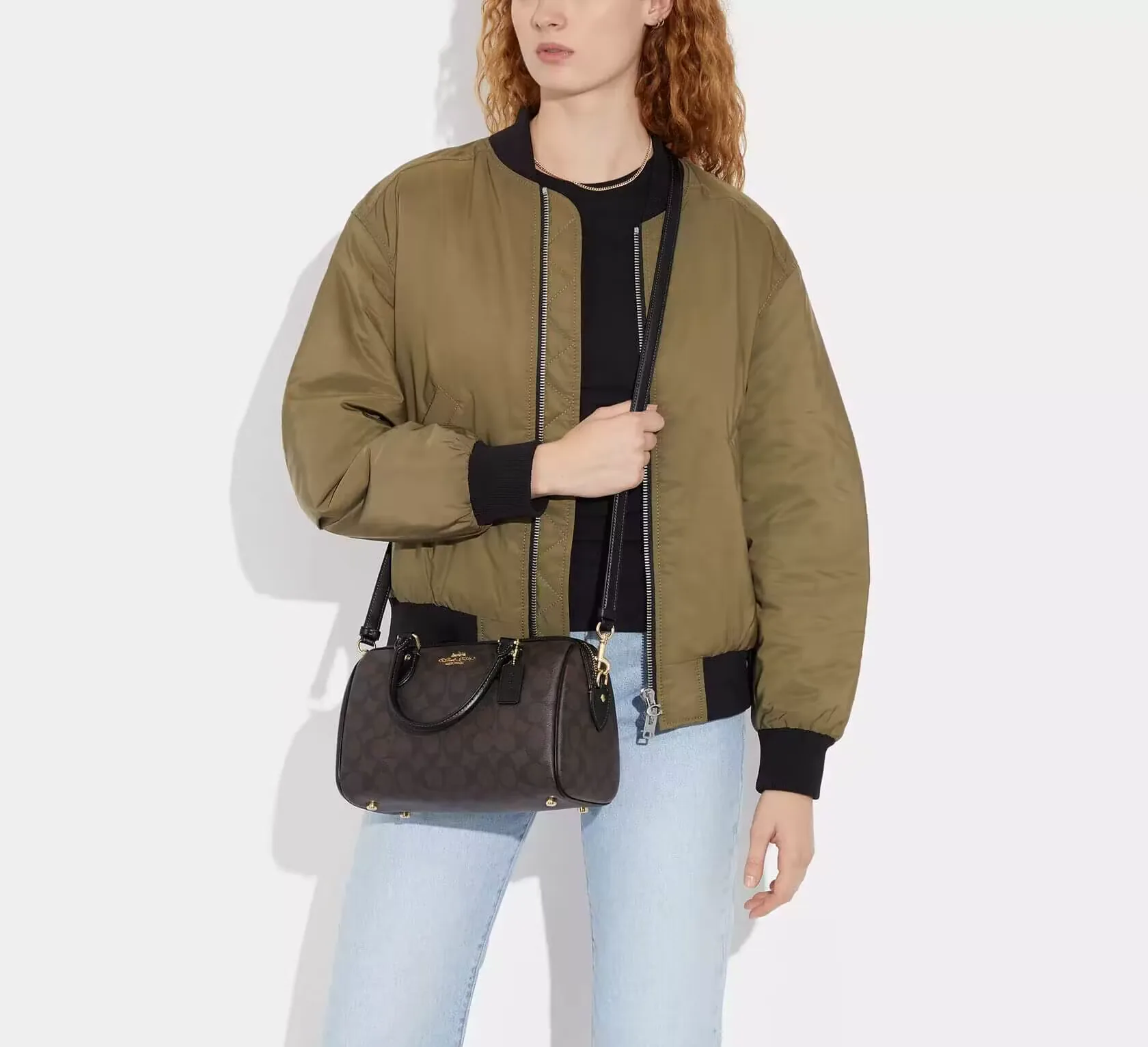 Стильная сумка Rowan Satchel сочетает фирменный канвас Signature с контрастными кожаными вставками в оттенках Brown Black и Gold. Модель выполнена из покрытого канваса и гладкой кожи, фурнитура золотистая. Основное отделение на молнии, есть внутренние карманы и внешний карман на молнии. Подкладка текстильная. Классическая форма и функциональная организация делают её идеальным аксессуаром на каждый день.