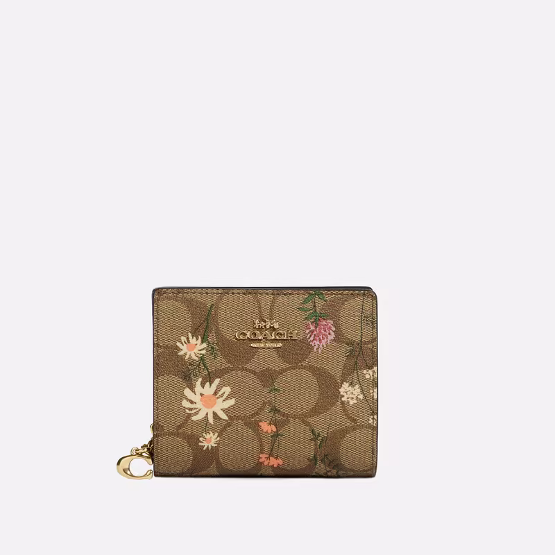 Кошелек Snap Wallet украшен цветочным принтом из полевых цветов на базе мягкого хаки (Khaki Multi), создавая образ природной элегантности. Модель выполнена из фирменного лакированного полотна Signature coated canvas с застежкой-кнопкой. Внутренняя организация включает основное отделение для банкнот, три специализированных слота для карт, прозрачное окошко для ID-документов и внешний карман на молнии для монет и мелких важных предметов.